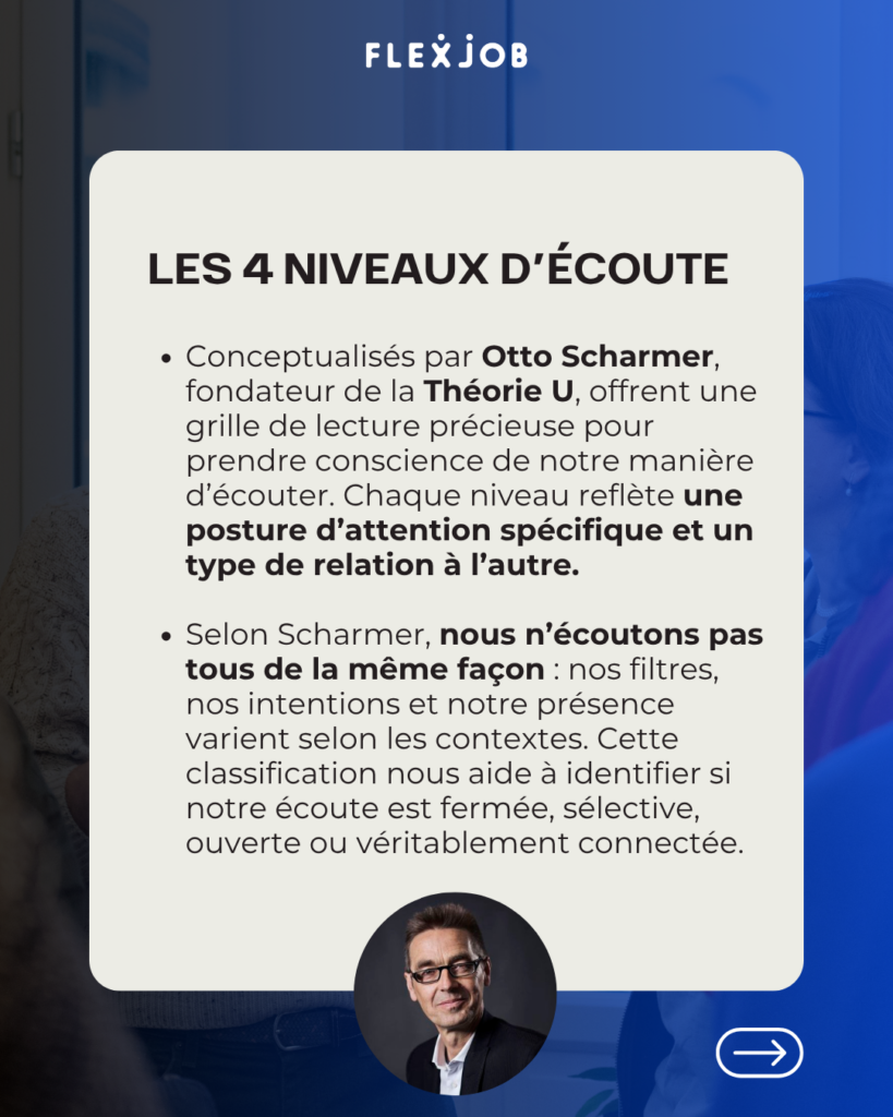 Les 4 niveaux d’écoute, conceptualisés par Otto Scharmer, fondateur de la Théorie U, offrent une grille de lecture précieuse pour prendre conscience de notre manière d’écouter. Chaque niveau reflète une posture d’attention spécifique et un type de relation à l’autre.