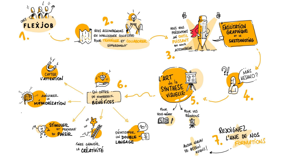 Elle permet de clarifier les échanges en réunion, d’améliorer la mémorisation des informations et de favoriser la collaboration en rendant les idées plus visuelles et engageantes.